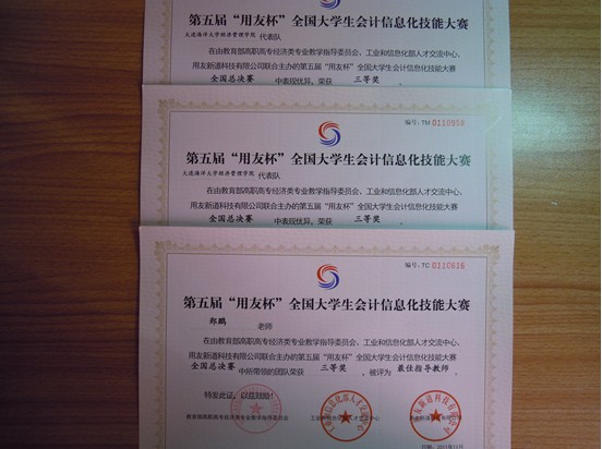 在近日结束的第五届“用友杯”全国大学生会计信息化技能大赛全国总决赛中,我院的两支参赛队伍均(参赛一队:王继芳、周雪静、周欢欢、韩鹏宇、顾博伟;参赛二队:李睿、余梦荻、古炜、任亚楠、孔嘉惠)获得全国三等奖的喜人成绩,同时我院郑鹏老师获得大赛“最佳指导教师”称号。