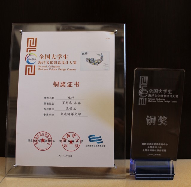 近日,在全国大学生首届海洋文化创意设计大赛中,我院学生罗禹禹、房鑫的作品《也许》获得铜奖,同时罗禹禹的作品《假如明天》获得优秀奖。