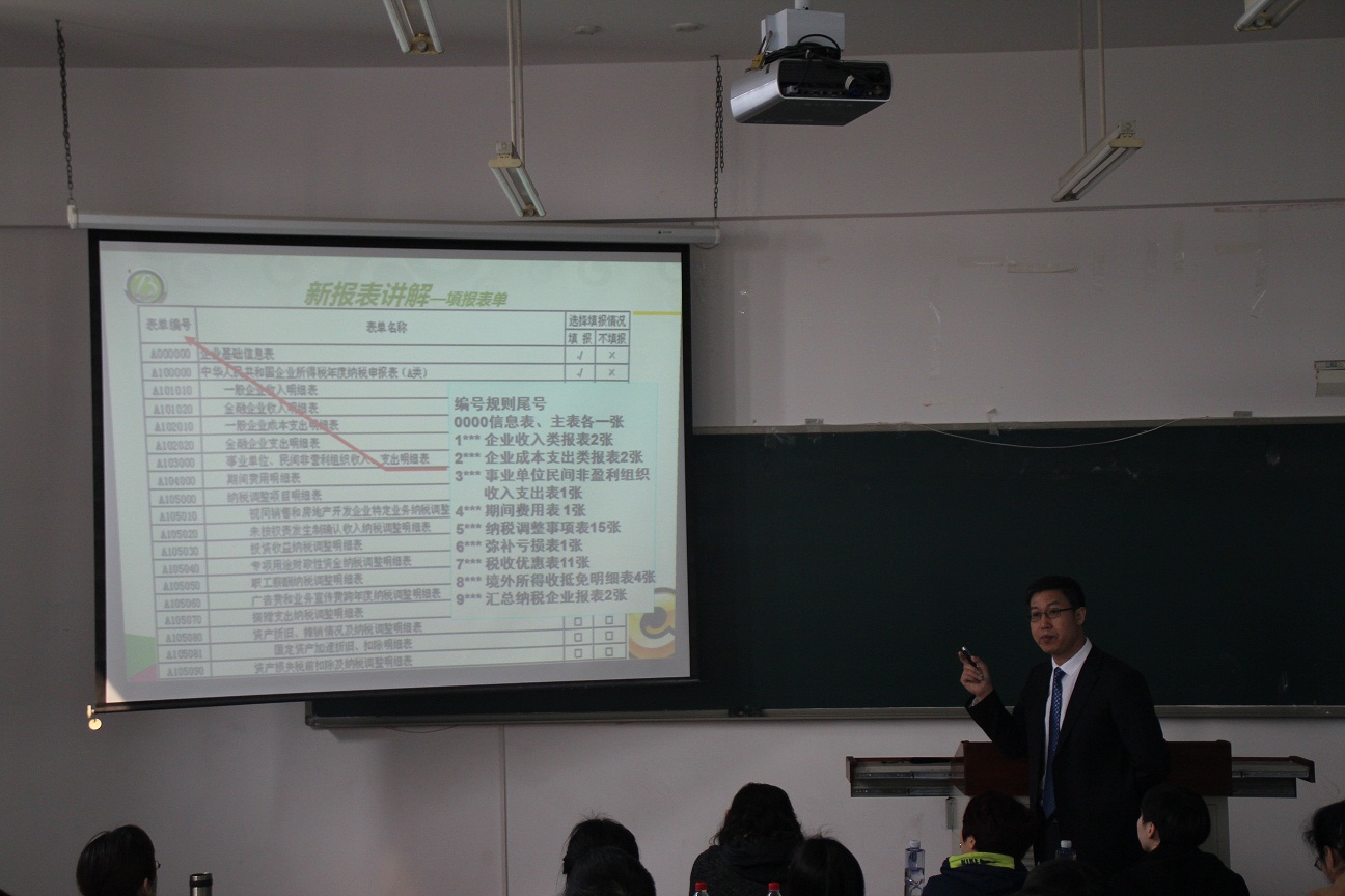 4月11日上午,太阳成集团tyc234cc第二期“社会大讲堂”在獐子岛教学楼103室举行。中国税务咨询师(CTC)讲师团首席专家、青岛市国税局兼职教师、海尔集团税务筹划顾问徐风照作了题为“新版企业所得税解析及财税处理技巧”的报告。学院师生聆听了报告。