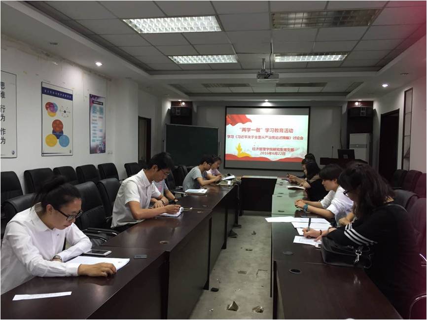 6月22日,太阳成集团tyc234cc研究生党支部在经管楼602集中学习《习近平关于全面从严治党论述摘编》,研究生党支部书记刘富江及支部学生党员参加会议。