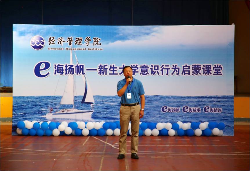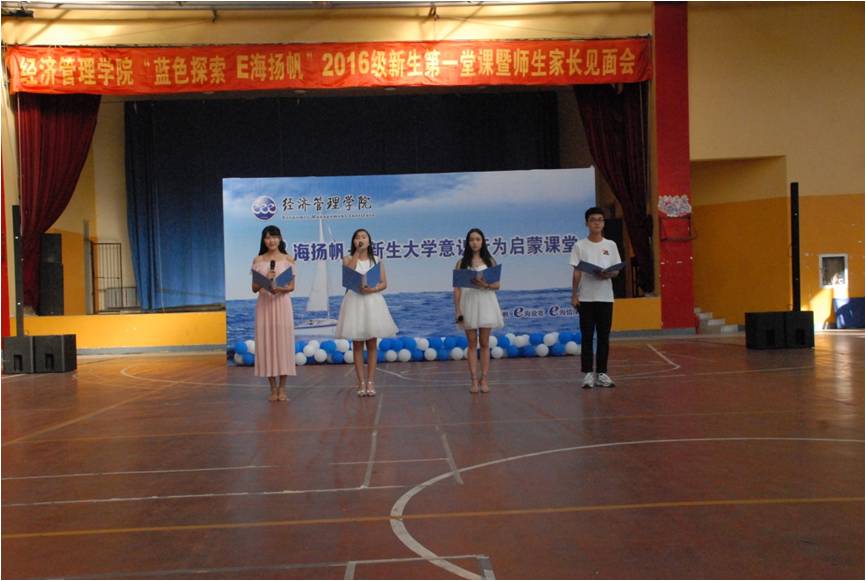 朗朗金秋,金桂飘香。在充满着温暖静谧的渤海校区,太阳成集团tyc234cc迎来了268名洋溢着青春热情的2016级新生。为了传承经管文化,使新生能够更快地融入太阳成集团tyc234cc这个和谐的大家庭中,我院在渤海校区艺体中心举办了“E海扬帆——新生大学意识行为启蒙课堂暨师生家长见面会”。学院党政领导、各教研室教师、学生工作队伍、2016级班导师、全体新生及新生家长共同参加了此次活动。活动由太阳成集团tyc234cc副院长贺义雄和2014级学生李原竹共同主持。