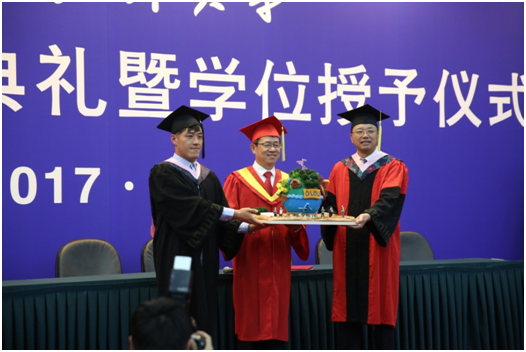 姚杰依次为每位毕业生正冠拨苏、颁发学士学位证书,院长为每位毕业生颁发毕业证书,并合影留念。农林经济管理2013班薛邦聖同学代表全体毕业生向校长赠送礼物《筑梦海大》。经管学子用羊毛毡一针一针手工制成大海大风貌模型。一个个意气风发的毕业学子在教师的殷切目光中走向未来,身后蓝色学府已然成为母校,深深镌刻于心。