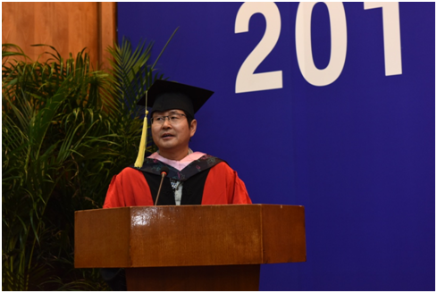经济与金融2013班班导师庄平代表全体教师发言。他希望毕业生拥有与人为善的情怀和包容天下的胸怀,并力所能及传播给自己的亲人和社会。