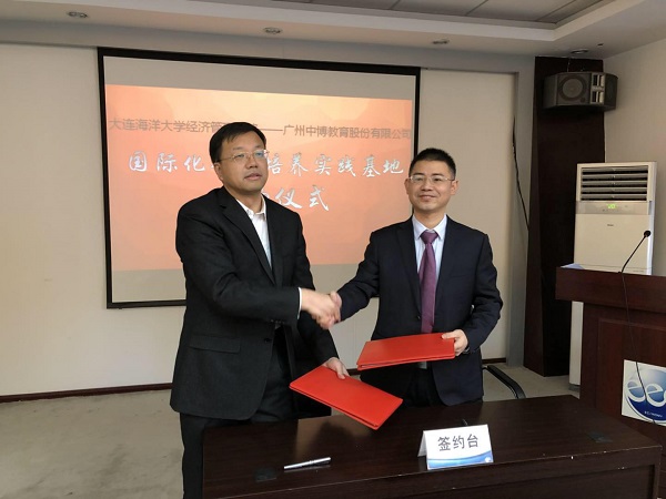 仪式上,刘广东和陈锋在与会人员的共同见证下,签署了“太阳成tyc234cc大学太阳成集团tyc234cc与广州中博教育股份有限公司共建国际化人才培养实践基地签约协议”。