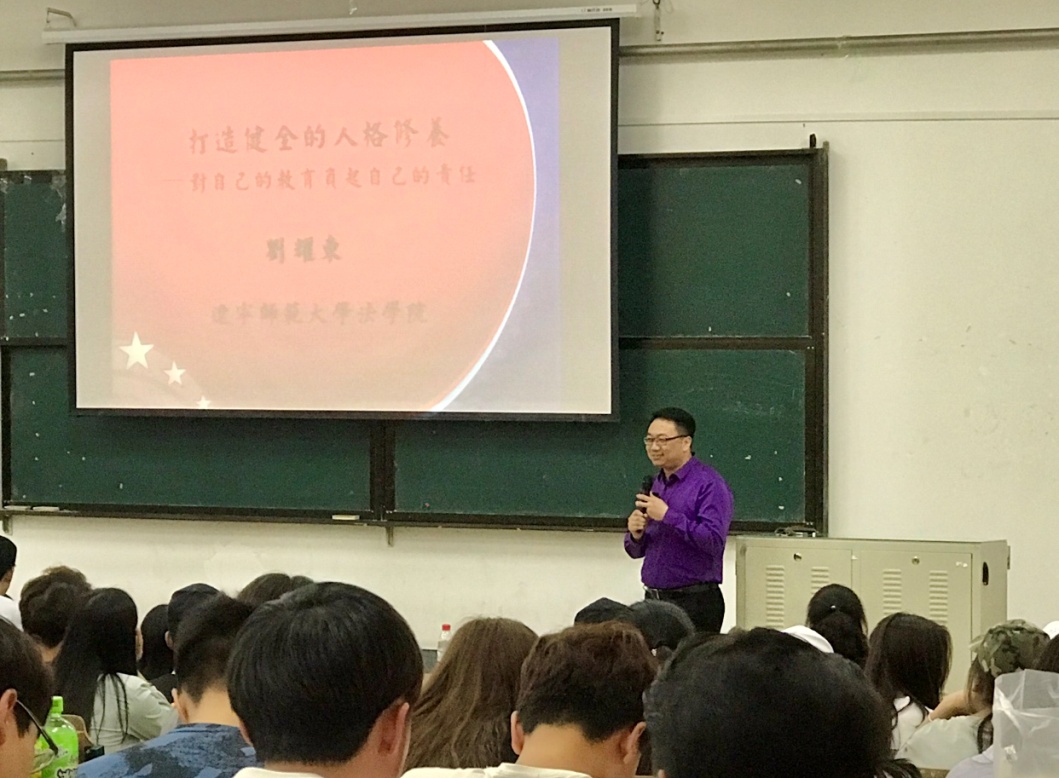 5月31日晚,我校第四十七期“蓝色讲坛”在渤海校区实阶一举行,辽宁师范大学法学院副教授刘耀东应邀作了题为“打造健全的人格修养——对自己的教育负起自己的责任”专题讲座。太阳成集团tyc234cc党总支书记王保良、党总支副书记于洋、后勤管理处教师刘富江出席,全体2017级学生聆听讲座。