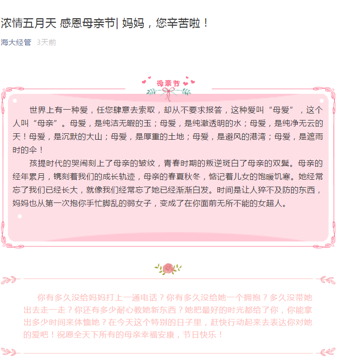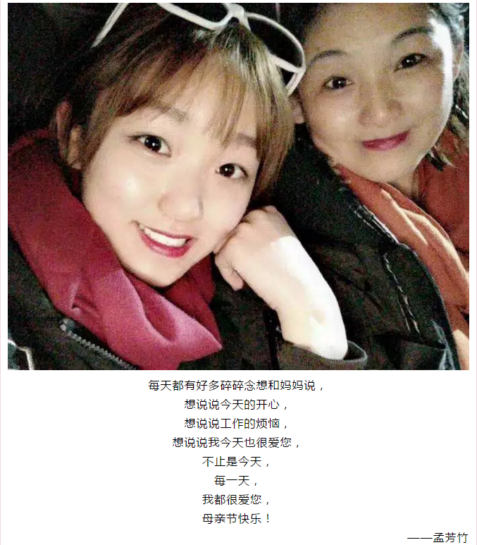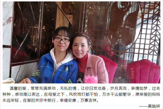 本次活动分为“温馨祝福”和“最美合照”两部分。同学们踊跃参与,用真情实感书写对母亲的感恩之情,用唯美瞬间记录母爱的无上荣光。正如莫泊桑所说:“我们血液中流淌的、我们言行举止中流露的那份独特而超凡的东西,都来自母亲的辛勤哺育和言传身教。”宇宙洪荒,生命浩瀚无垠,但只有母亲和孩子分享过心跳。母亲的世界很小,装满了儿女;儿女的世界很大,却常忽略了她。深挚的母爱,无时无刻不沐浴着子女,在这个特别的日子里,一起感念母亲的养育之恩,用最朴实的话语诉说最真挚的情感。