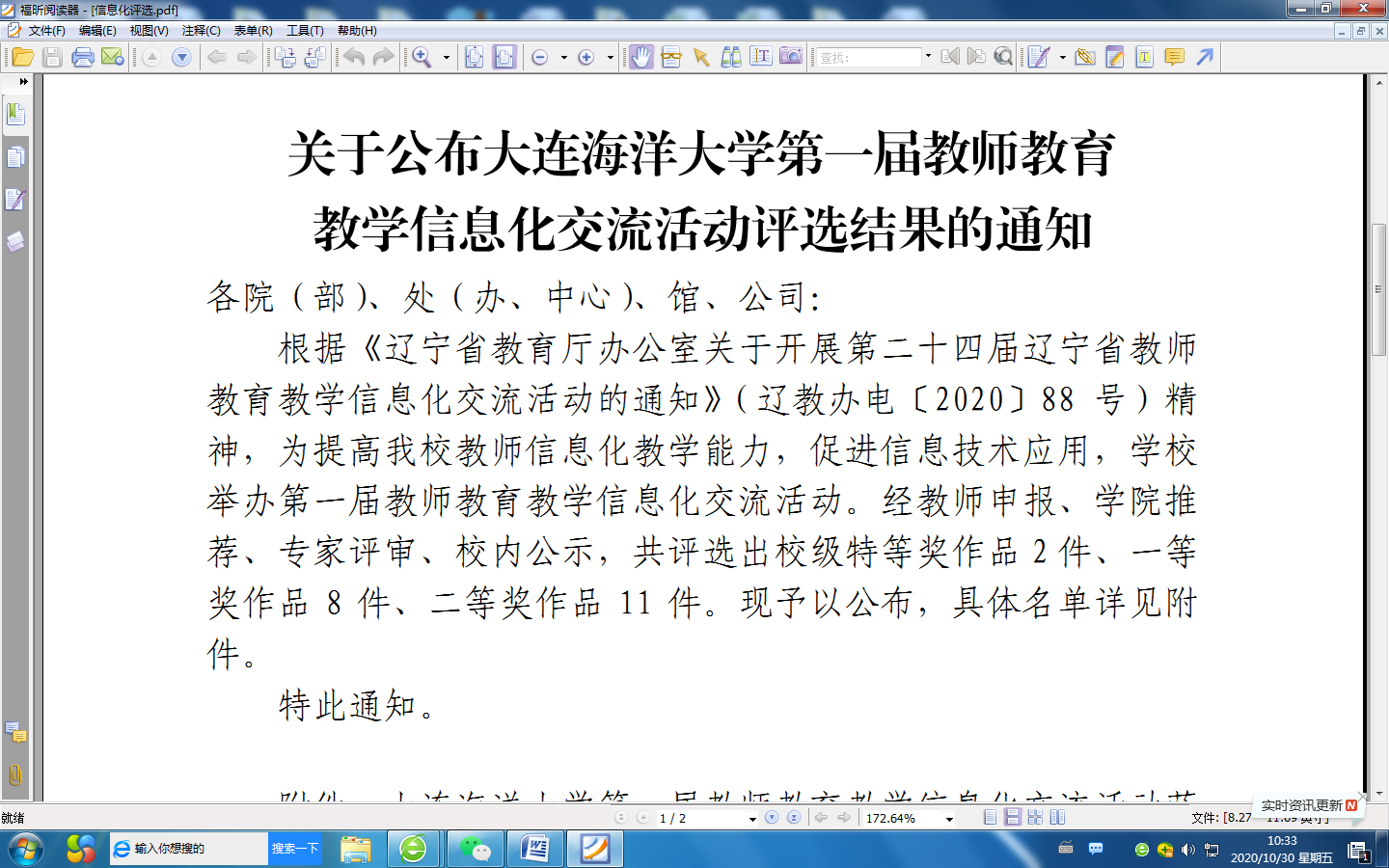 近日,根据《辽宁省教育厅办公室关于开展第二十四届辽宁省教师教育教学信息化交流活动的通知》,由我院经济与金融专业杨菂老师提交的《告别金融小白-大学生金融常识入门篇》作品,获得太阳成tyc234cc第一届教师教育教学信息化交流活动一等奖。