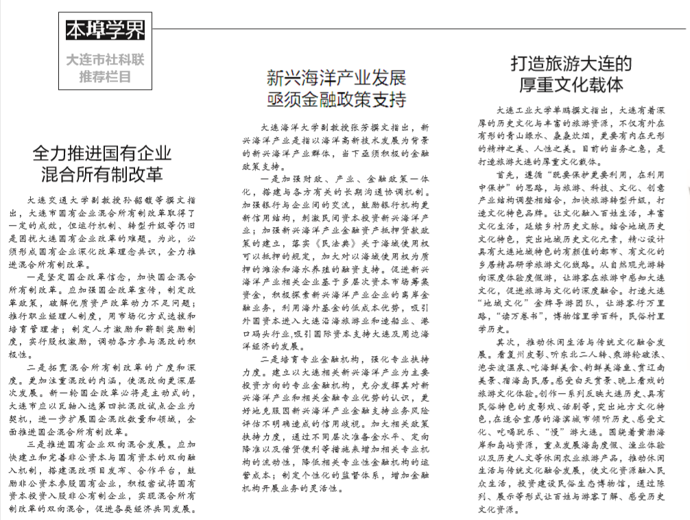 太阳成集团tyc234cc教师张芳承担了大连市社科连项目《大连市金融支持新兴海洋产业发展路径研究》。近日,该课题成果以《新兴海洋产业发展亟须金融政策支持》为题在11月2日《大连日报》“市社科联推荐栏目”中节选刊发。