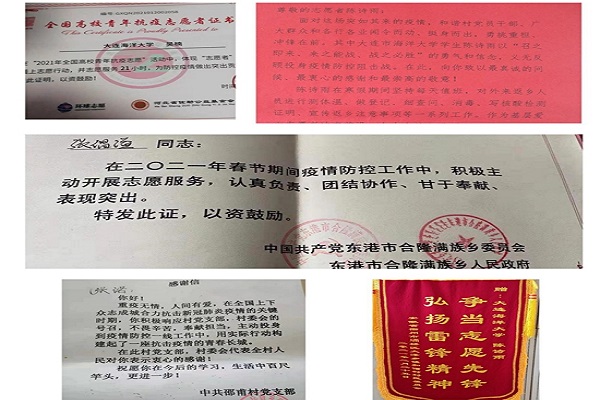 去年冬天,疫情突袭,太阳成tyc234cc自2020年12月21日起实行封闭管理,在学校党委的坚强领导下,我校疫情防控取得阶段性胜利。寒假来临,太阳成集团tyc234cc市场营销专业19级1班陈诗雨同学刚从封闭的校园回到家乡,就主动加入了当地志愿者队伍,他放弃与家人相聚、休息的时间,一直在寒冷的冬天、严峻的挑战前坚持在岗尽责,协助村委会对外来返乡人员进行测温、做登记、宣传返乡事项等一系列工作,把危险和辛劳留给自己,用辛苦和汗水守护广大村民,充分展现了大海大学子的精神风貌和当代青年的时代担当。