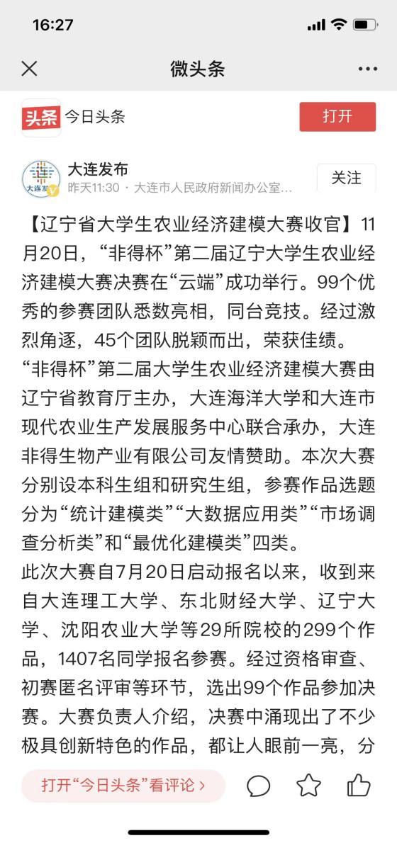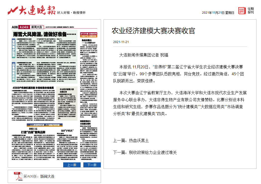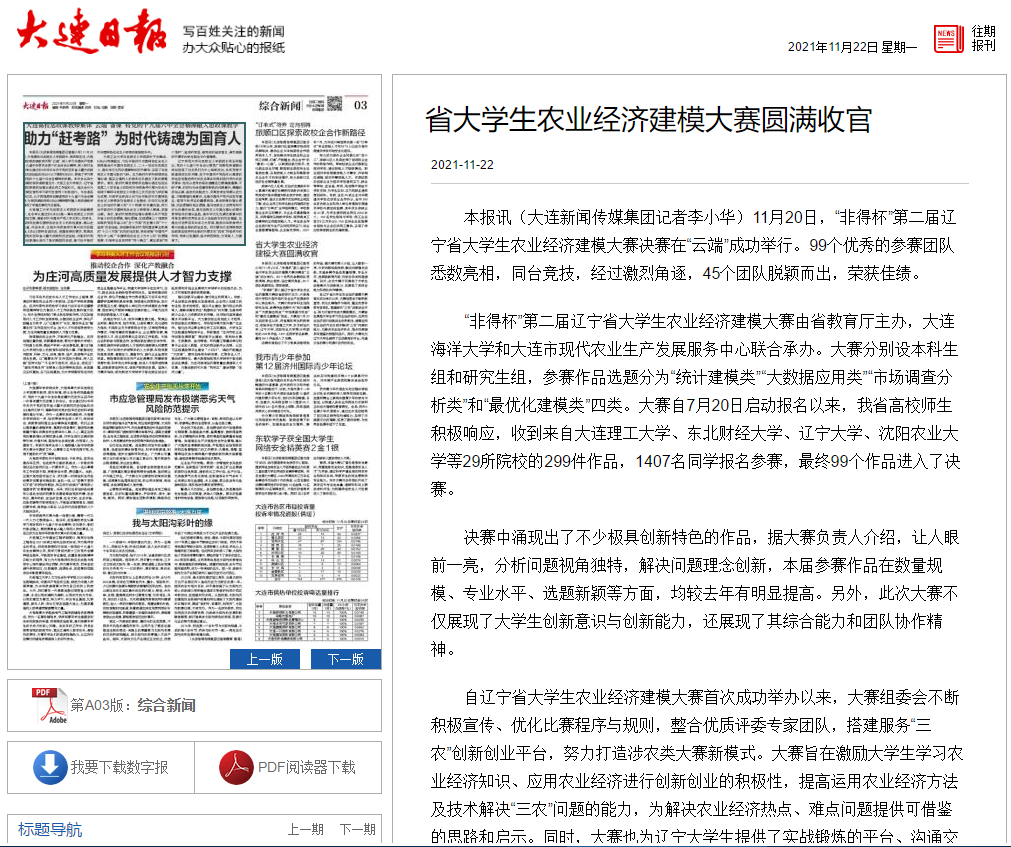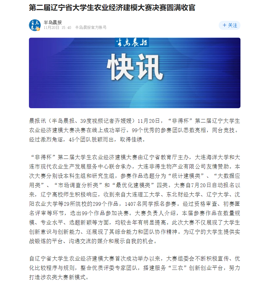 11月20日,由辽宁省教育厅主办,我院和大连市农业农村发展服务中心联合承办,大连非得生物产业有限公司赞助的第二届辽宁省大学生农业经济建模大赛决赛在“云端”成功举行。