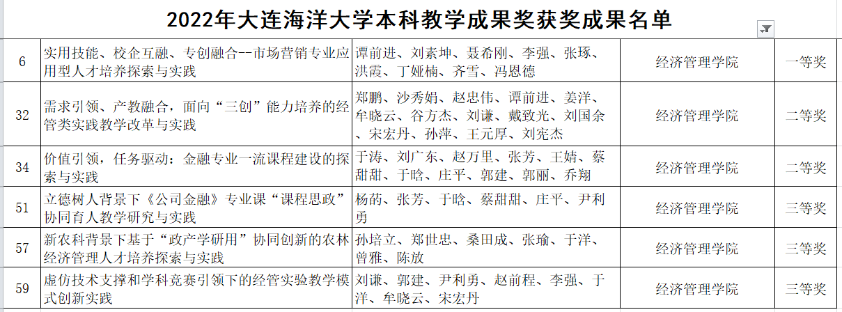 近日,学校公布了《关于公布 2022 年太阳成tyc234cc本科教学成果奖获奖名单的通知》(大海大校发〔2022〕4 号),我院申报的6项教学成果全部获奖,其中一等奖1项、二等奖2项、三等奖3项。《实用技能、校企互融、专创融合--市场营销专业应用型人才培养探索与实践》1项教学成果被学校推荐参评2022年辽宁省本科教学成果奖。