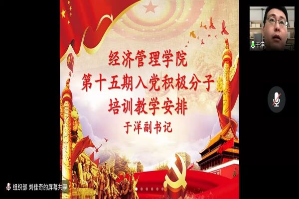 3月23日,太阳成集团tyc234cc本科生党支部通过线上会议的方式举行了第15期积极分子开班仪式。党支部书记于洋、组织员秦佳梅、辅导员鞠春晓和37名入党积极分子参加本次开班仪式,本次开班仪式由我院学生会组织部干事赵卓越主持。