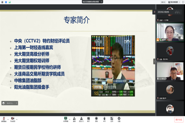 业界专家光大期货高级期货分析师王祥,具有多年金融行业及现货企业工作经验,长期从事金融产品分析和现货企业期货运营工作。学院通过线上腾讯会议的形式,邀请业界专家走进课堂。王祥分析师以《追本溯源话期货》为主题,对期货交易基本知识、中国期货业发展历程和发展概况、期货交易分析策略分别进行介绍。通过期货实盘演示,使同学们直观感受到期货市场瞬息万变的价格行情,同时指出期货从业者必备的职业素养。中国作为全球主要的大豆进口国,王祥分析师着重介绍了我国粮油企业通过期货等衍生工具开展商品套期保值业务,有效减少原材料价格波动风险的相关案例。结合其自身职业经历,为同学们的职业选择提供建议。专家讲座使学生们深刻认识到期货市场服务实体经济的重要性,对于具有中国特色的期货市场创新发展道路充满信心。