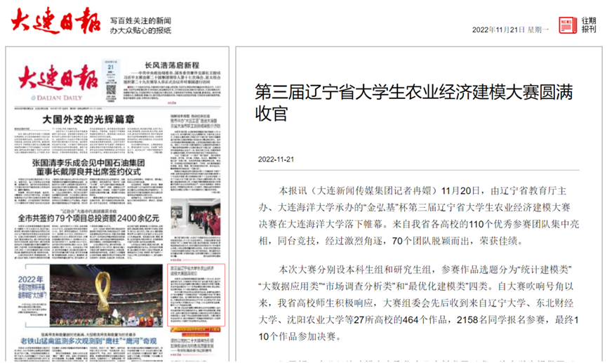 11月20日,由辽宁省教育厅主办,我院承办的“金弘基”杯第三届辽宁省大学生农业经济建模大赛决赛在我校举行。大赛开幕式在图书馆报告厅举行,副校长张国琛出席开幕式并致辞。来自高校和行业企业的10位评审专家、我校创新创业学院、我院相关负责人、我校的参赛队伍线下参加开幕式,省内其它高校的参赛队伍线上同步参加开幕式。