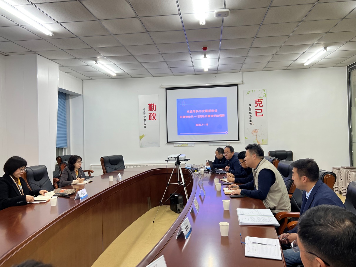 田春艳处长就学院工商管理一级学科建设与农推硕士培养等与学院教师展开讨论和交流。田春艳强调,学科是龙头,专业是立院之本,学院应聚焦新文科建设,把握乡村振兴战略,抓住发展机遇,推动学院学科和专业建设快速发展。张文锋表示,在学科与发展规划处的大力支持下,学院将整合资源,强化研究生实践能力培养,让研究生把论文写在乡村振兴的道路上,提升研究生的培养能力,提高学院学科建设水平。