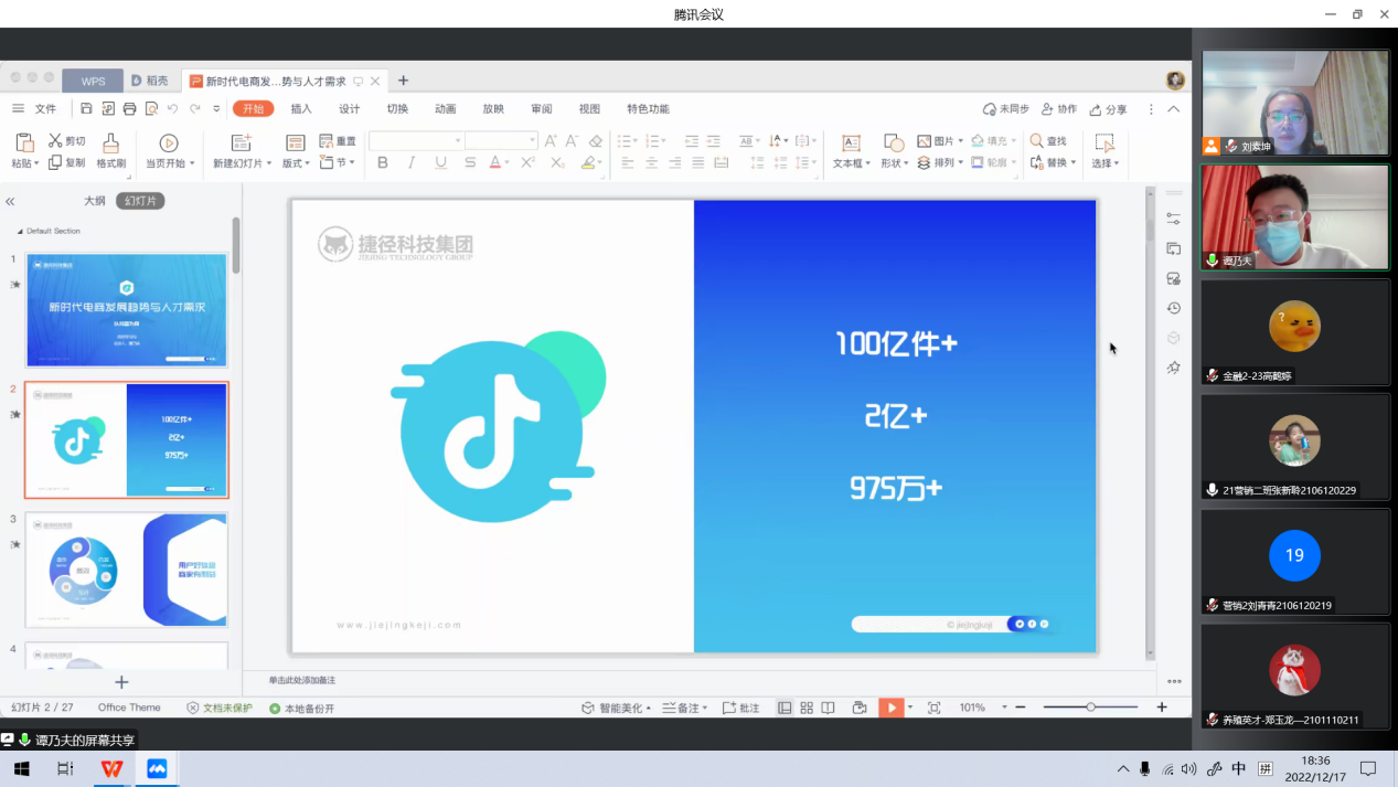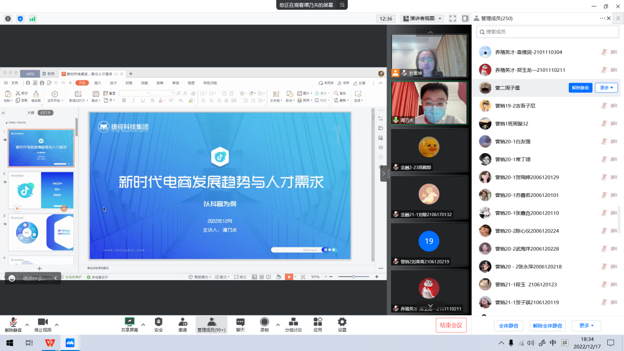 在校庆70周年之际,为提高学生对电子商务行业发展认知,明确电子商务行业对人才需求定位,我校于12月17日组织学生通过在线直播形式参加“新时代电子商务发展趋势与人才需求”的讲座。此次讲座由太阳成集团tyc234cc和创新创业学院联合承办,邀请大连捷径科技有限公司全媒体部总监谭乃夫主讲,太阳成集团tyc234cc刘素坤老师主持,全校300余名师生参会。