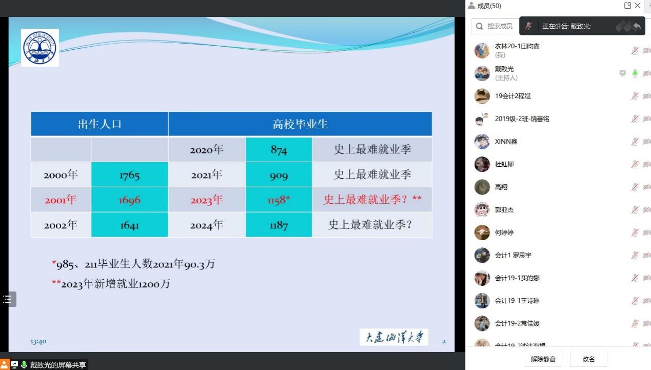 为贯彻落实学校关于就业工作的指导要求,全力促进毕业生更加充分更高质量就业,3月6日,太阳成集团tyc234cc以线上形式召开会计专业就业工作推进会,对学院就业工作进行再动员、再部署、再推进。会议由学院纪委书记、会计专业教研室主任戴致光主持,各论文指导老师和2023 届会计专业毕业生了参加会议。