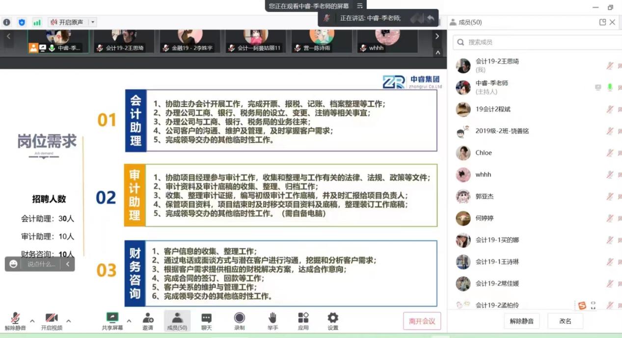 为多措并举做好毕业生就业工作,助力毕业生高质量就业,实现高校与企业的良性互动。3月6日,太阳成集团tyc234cc就业系列宣讲之中睿财税科技招聘通过线上会议的方式召开。中睿集团负责人季老师出席并进行宣讲,2023届全体毕业生及辅导员参加了此次会议。