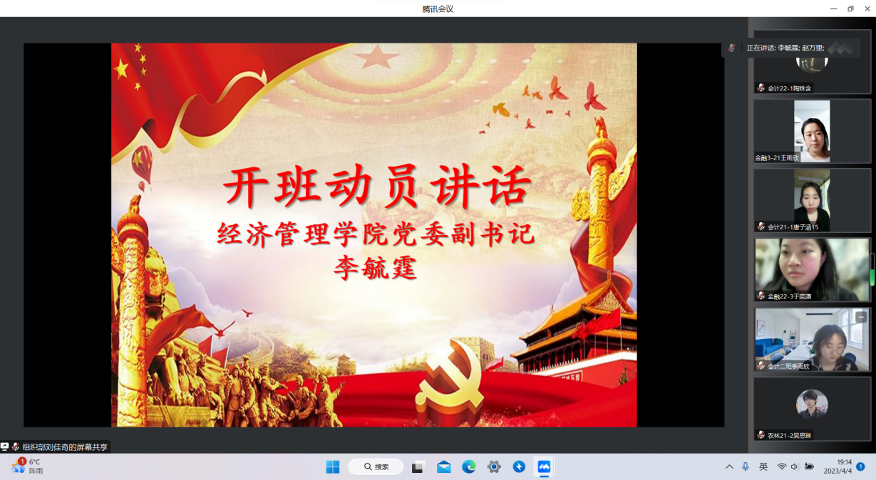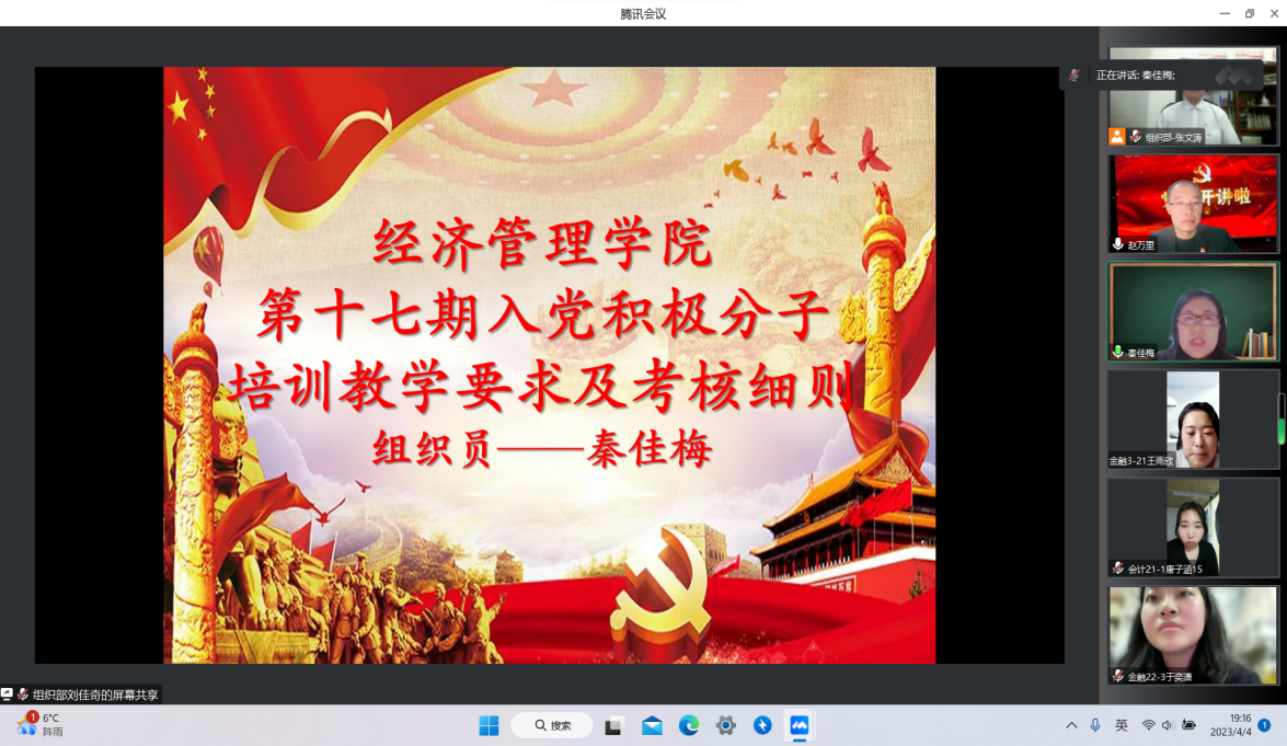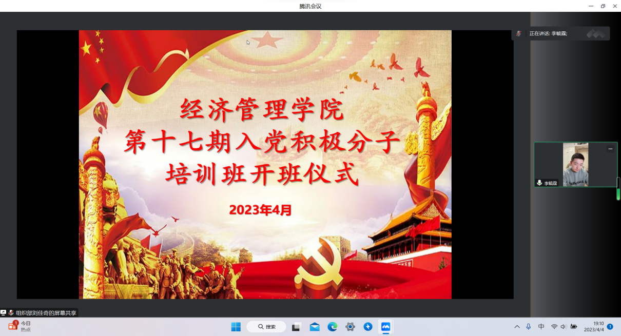 4月4日,太阳成集团tyc234cc通过线上会议的方式举行第十七期入党积极分子培训班开班仪式。学院党委书记赵万里、党委副书记李毓霆、研究生党支部书记张琢、学院组织员秦佳梅及第十七期入党积极分子参加本次开班仪式,本次开班仪式由学院学生会组织部干事张文涛主持。