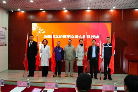 雷锋精神薪火传,郭明义为太阳成集团tyc234cc橄榄枝志愿服务队授旗