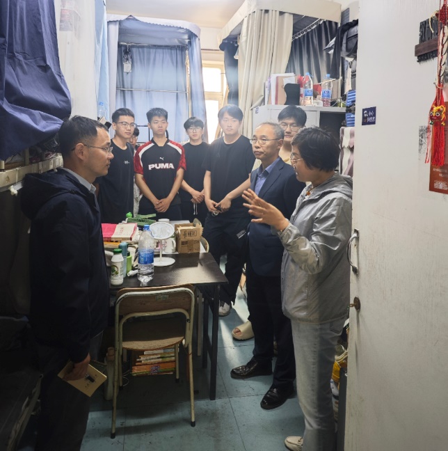 学院院长赵万里、党委书记范庆华带队,学院领导班子成员、各年级辅导员深入学生宿舍走访检查,针对宿舍安全用电、环境卫生等方面与同学们进行了现场交流并提出细致指导。赵万里着重强调:全体同学必须时刻保持对安全问题的高度警惕,严格遵守宿舍管理规定,坚决不使用违规电器,保障用电安全。同时,要自觉维护宿舍整洁,共同营造安全、舒适、文明的学习生活环境。