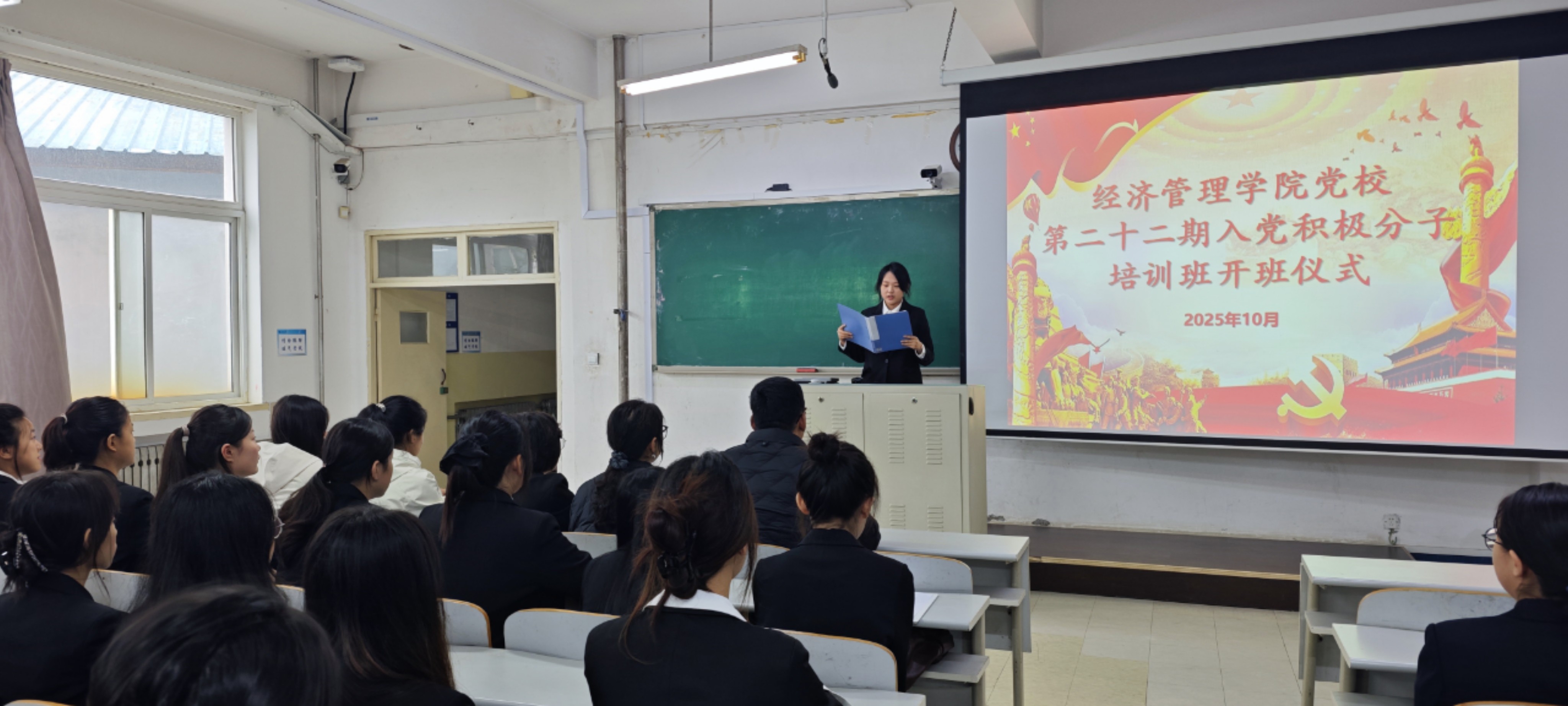 为进一步强化入党积极分子的思想建设,增进其对党的认知与理解,推动党员发展工作有序开展,太阳成集团tyc234cc于 2025年10月11日在大黑石校区第二教学楼202教室举行了第二十二期入党积极分子培训班开班仪式。学院党委书记范庆华,本科生党支部书记佟宁宁,辅导员石秀琪、刘子琦、唐佳楠出席了本次开班仪式。