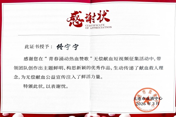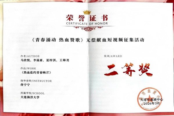 近日,由大连市卫生健康委、大连市委教育工委、共青团大连市委员会、大连市红十字会及大连市献血办联合主办的“青春涌动 热血赞歌”无偿献血短视频征集活动顺利落幕,我院参赛作品《热血赴约青春映芒》立意鲜明、镜头鲜活,凭借真挚的青春表达,从全市众多参赛作品中脱颖而出,荣获二等奖。4月9日,颁奖仪式在大连市血液中心6楼学术报告厅举行,指导教师佟宁宁、学生代表李晟豪、夏梓淇参加。